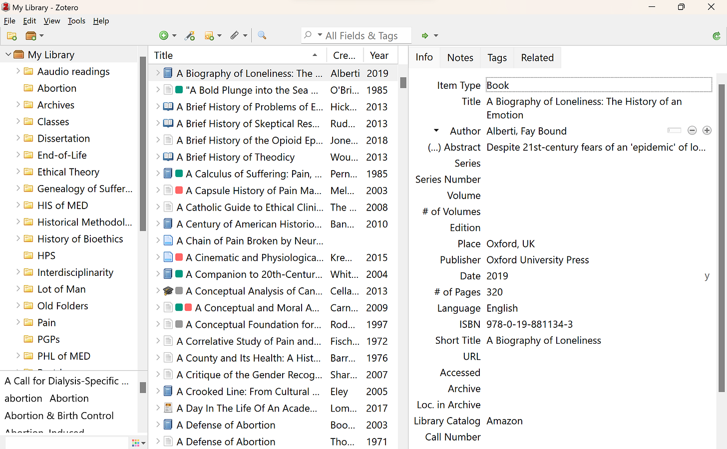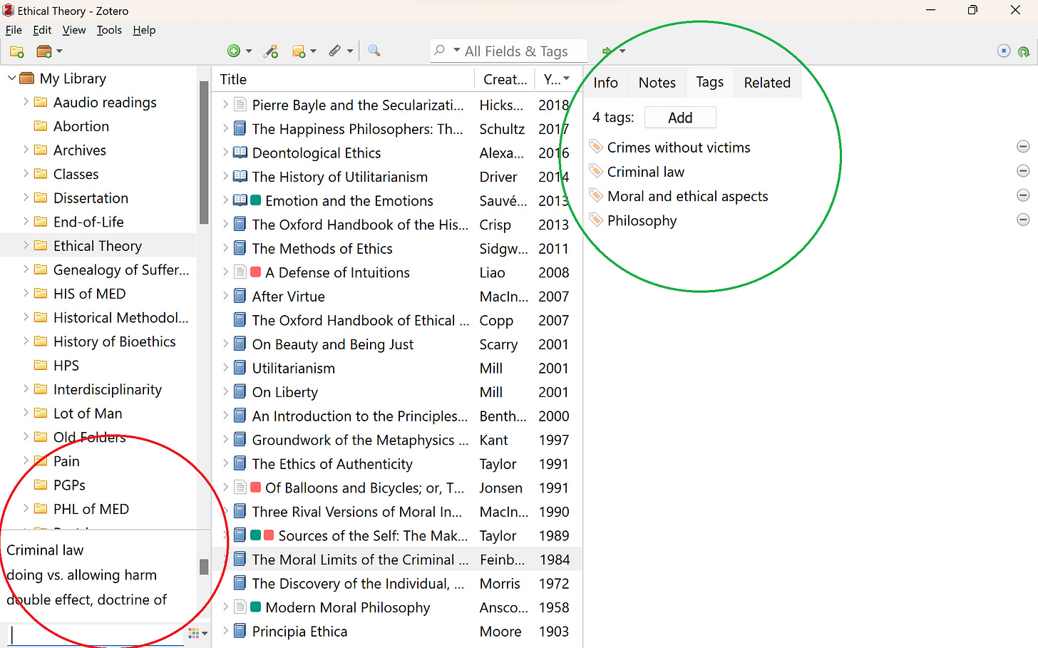 SEARCHING YOUR NOTES: All at once, you can perform word searches across your entire library, as well as in each folder. That includes all the records of all your readings and every note you have ever drafted. Very often, I can only recall a snippet of an interesting insight I read somewhere, that I know is in my notes but not which one. A quick search pulls all that information up and has saved me the trouble of finagling, googling, etc., to track down quotes, citations, and the like. You can also tag your notes to build these connections pre-emptively. Also, when you download texts, the publisher’s tags already come with it. For an example, the green circle below shows you how Joel Feinberg’s “The Moral Limits of the Criminal Law” automatically appears in my Zotero library, while the red circle highlights where to search for tags alone (as opposed to the “All Fields & Tags” search bar at the top of my library):