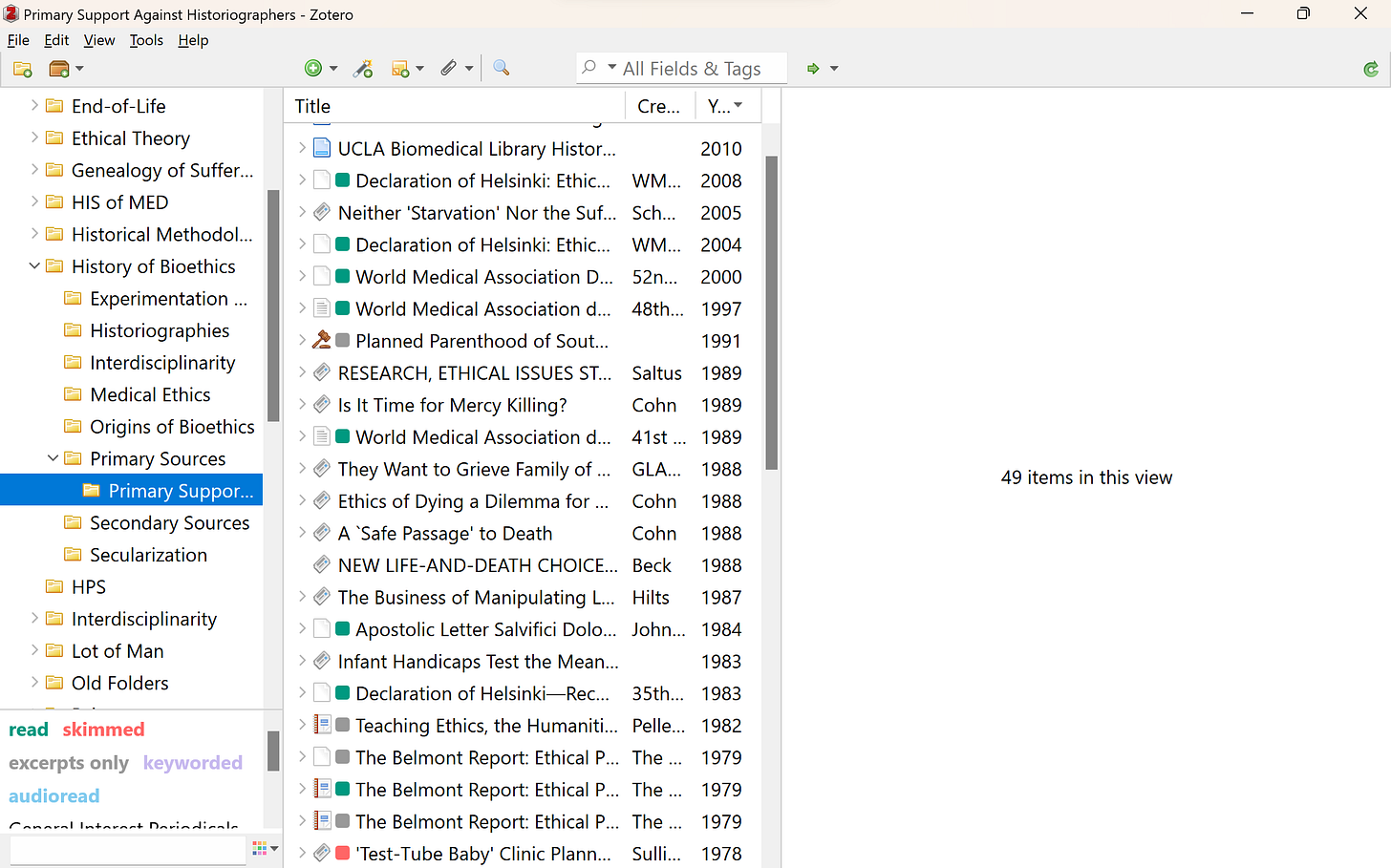 TRACKING YOUR READING PROGRESS: On the subject of tags, you can right-click your tags to color-code them, which I have found incredibly useful as a tracking system for the sources that are unread, read, skimmed, excerpted, keyworded, and so on. This has proved especially handy when dealing with large volumes of literature across multiple projects. For example, below is a folder in my library, where you can see in the bottom left corner the meaning I have assigned to each color. The colors, in turn, appear as little squares beside the title of my items. In my library, every item without a color is presumed to be unread.