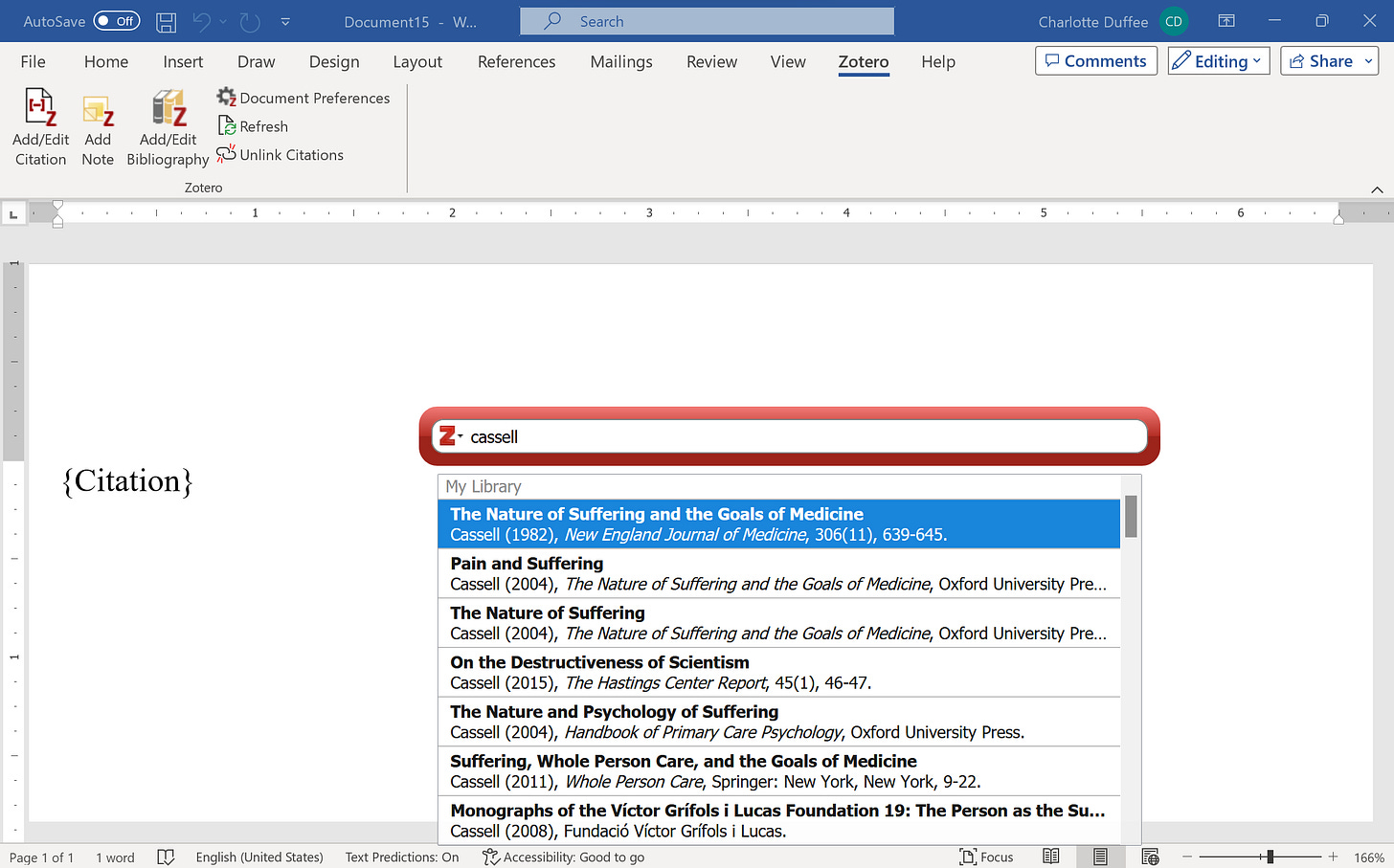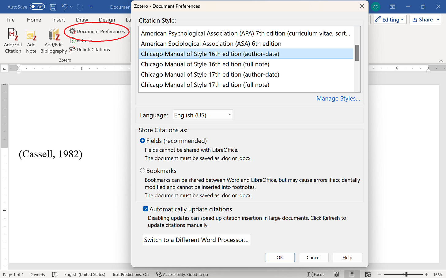 CITING: When you download Zotero, it automatically adds a new button to your Microsoft Word processor, allowing you to search for sources in Zotero and cite them automatically, as in the first image below. It’s easy to change citation styles, too—say, for a rejected manuscript you’re keen on submitting elsewhere. All you have to do is select the ‘Document Preferences’ button in the top left hand corner, per the second picture.