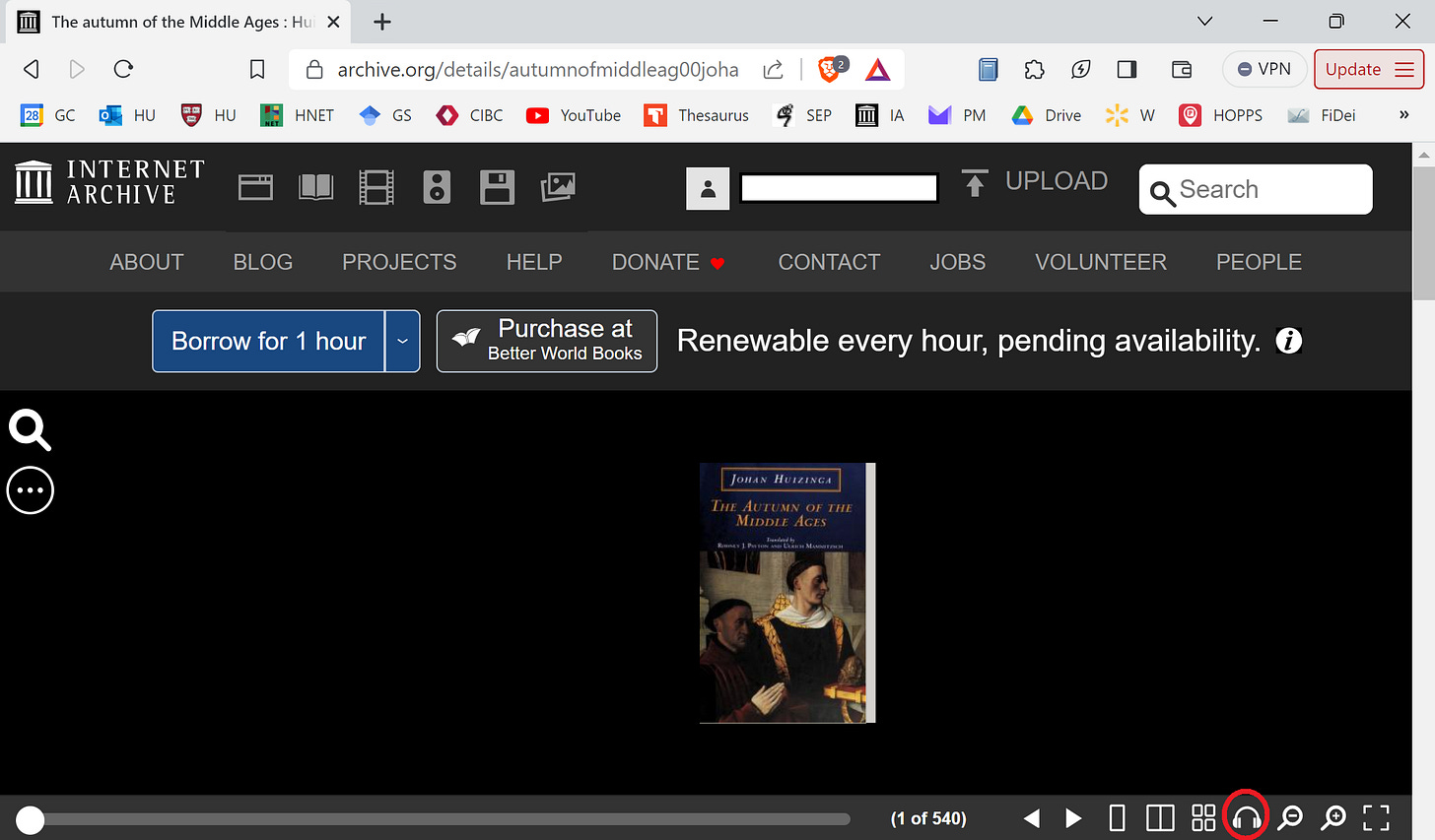Of course, one problem for Voice Dream is that many of the texts we want to listen to don’t exist digitally—at least not in formats that are legally downloadable. One way around this is Internet Archive. While you can download a lot of books as Voice Dream-compatible PDFs/HTMLs at the bottom of the page on Internet Archive, not all of them have this feature; many can only be borrowed for repeated hour-long intervals. A lot of scholars know this already. But what they might not know is that Internet Archive can read you these texts. Simply click the headphones icon in the platform’s bottom right-hand corner (see circled image below). Do note that the pronunciation and speed-control are sometimes wanting.